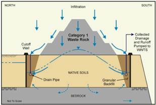 The permanent stockpile of Category 1 waste rock will sit over a containment system: cutoff walls will surround the 526-acre pile, and a drainage collection system will collect groundwater within the system. The cutoff wall will be attached to the bedrock to limit the amount of water that escapes the system without going through the wastewater treatment system. To reduce or avoid leaching through the cutoff walls, the containment system will include “drawdown” technology to maintain an inward gradient so that potential leaching through the containment system would bring additional water into the system, rather than out of the system. Wastewater collected in this containment system will be sent to a wastewater treatment system (WWTS).