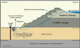 The permanent stockpile of Category 1 waste rock will sit over a containment system: cutoff walls will surround the 526-acre pile, and a drainage collection system will collect groundwater within the system. The cutoff wall will be attached to the bedrock to limit the amount of water that escapes the system without going through the wastewater treatment system. To reduce or avoid leaching through the cutoff walls, the containment system will include “drawdown” technology to maintain an inward gradient so that potential leaching through the containment system would bring additional water into the system, rather than out of the system. Wastewater collected in this containment system will be sent to a wastewater treatment system (WWTS).