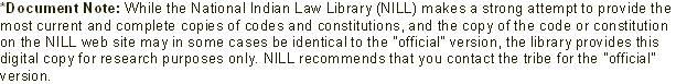 The tribe has not given permission for the full-text tribal code to be made available online. Please contact the library for assistance.